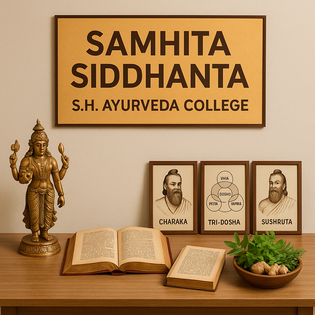 The Samhita & Siddhanta Department forms the foundational pillar of Ayurvedic education at S.H. Ayurveda College. This department is dedicated to imparting classical Ayurvedic knowledge through the study of original Ayurvedic scriptures such as Charaka Samhita, Sushruta Samhita, Ashtanga Hridaya, and other authoritative texts. We aim to help students build a strong conceptual understanding of Ayurvedic principles, including Tridosha theory, Panchamahabhuta, Sharira, Hetu, Vyadhi, and the philosophical foundations of life and health. Our teaching integrates traditional wisdom with modern interpretative methods, ensuring that students not only learn the texts but also understand how to apply them in clinical practice.